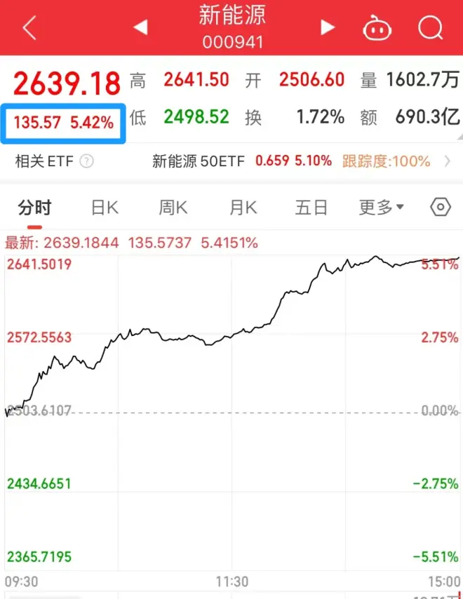 行业层面,新能源是今天最靓崽。储能暴涨5.66%,光伏暴涨5.55%,新能源车暴涨4.49%,直接大翻身。