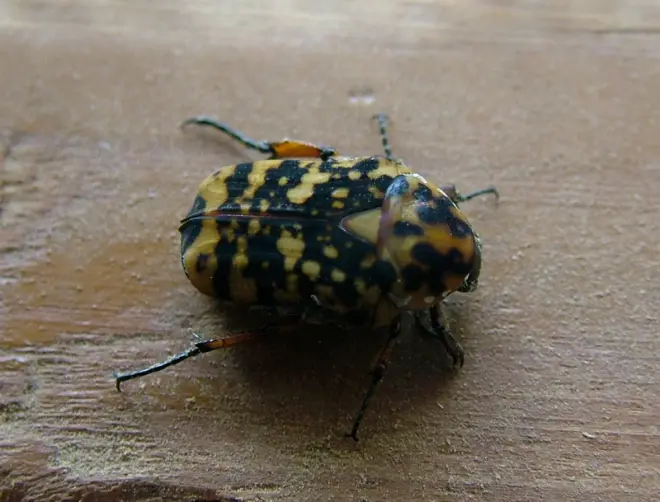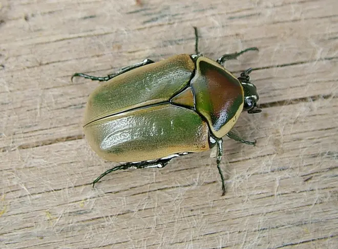 花金龟的成虫还有一大特征就是在展翅飞行时鞘翅是不会整个打开的,而是只将鞘翅两侧掀起伸出后翅