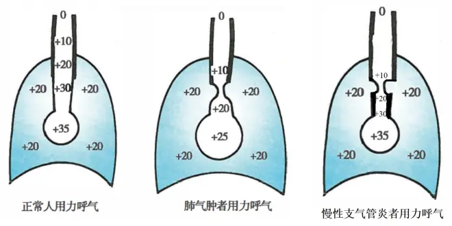 (2)慢性支气管炎:气道水肿、粘液增多,管壁增厚,支气管痉挛→小气道阻塞,用力呼气时气压下降快,提前出现等压点