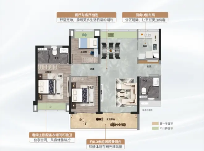 约6.4米超阔阳台,兼具生活实用性和观景功能,可以是养花、健身、儿童玩乐、品茶空间……随心定义功能,创造满足自身兴趣的一方天地。