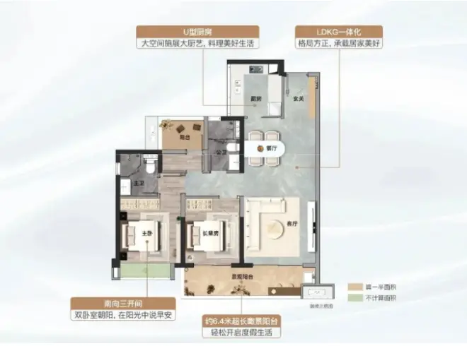 南向约6.4米的观景阳台,阅盘无数的扬哥表示也是少见,这可是同户型产品中少见的大面宽阳台,营造出大平层级的阔绰享受和宽境视野,目之所及都是美景。