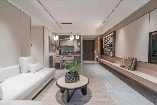 轩阔客餐厅衔接约6.8米南向景观阳台,构成通透敞亮的会客休闲空间,即使人坐在家中,也能轻易感受到光与自然的温柔。