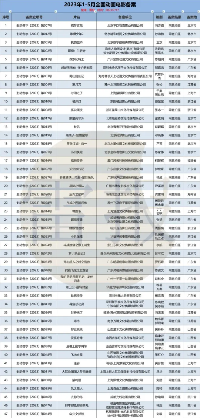 7月10日,国家电影局发布了关于2023年5月下全国电影剧本(梗概)备案、立项公示的通知。雷报通过进一步的整理和统计获悉,2023年1月至5月,全国电影剧本(梗概)备案、立项通过影片中,动画电影共备案47部,其中1月共11部,3月共16部,5月共20部,2月、4月没有动画电影备案。