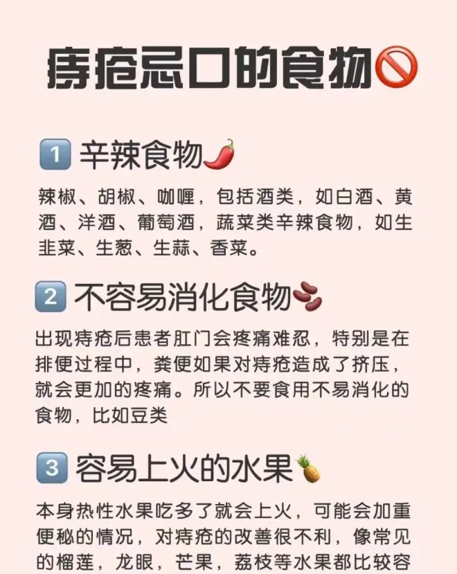 还有些注意事项: 早睡早起。有说法睡不好容易大便干燥,间接加重痔疮,所以为了身体还是要早睡。 多运动。做些瑜伽、提肛、跳绳之类的运动,既可以增加胃肠蠕动减少便秘,还能增强体质。 忌口辛辣。我现在饮食很清淡,红薯、玉米和水果类经常吃,一点都不碰了。