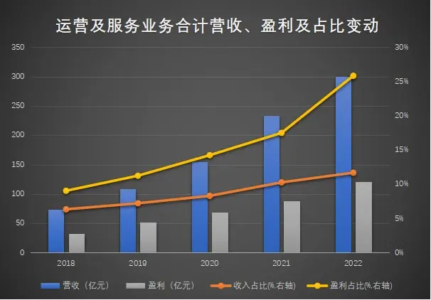 服务业务及其他2022年营收181.49亿元,同比增长39.82%,盈利52.62亿元,同比增长99.33%,几乎翻倍。该业务也是集团三大业务板块中,收入及利润增长最快的板块。2022年服务业务及其他的营收及盈利在集团整体中的占比分别达到7.06%和11.24%,较2021年进一步提升。