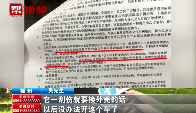 吴先生说,他在今年7月31日向福州的一家租车公司租了一辆电动汽车,从事网约车运营。近期发生了一次碰撞,导致车辆电池保护套受磨损。他本以为只要小修小补,但是收到了包括维修费等一系列报价超过2万元。他怀疑自己被“套路”了。