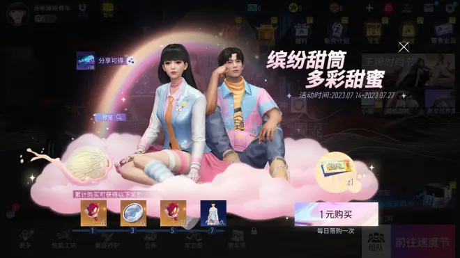- 自古蓝粉出CP,撞色才是真时尚!一元穿新装的机会又来啦,车手们在7月14日-7月27日,车手们每日购买豪车通用签约券,都能获得超值额外奖励。累计购买七次,即可解锁全新时装-樱粉少女/樱粉青春,充满活力的糖果色穿搭,让你的整个夏日充满缤纷甜蜜。